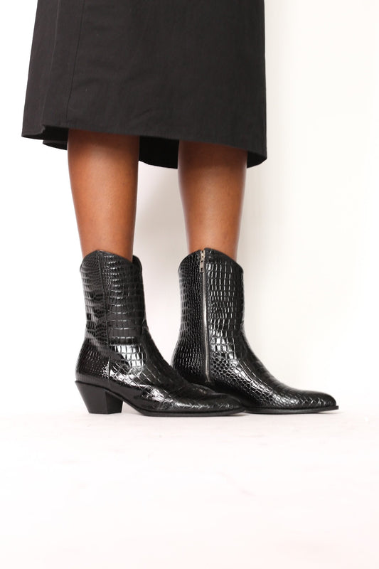 BLACK CROCODILE EMBOSSED MID HIGH BOOTS FLOR