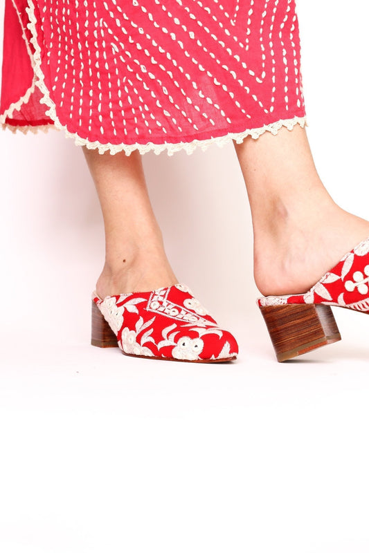 ROTE PANTOLETTEN MIT STICKEREI UND ABSATZ