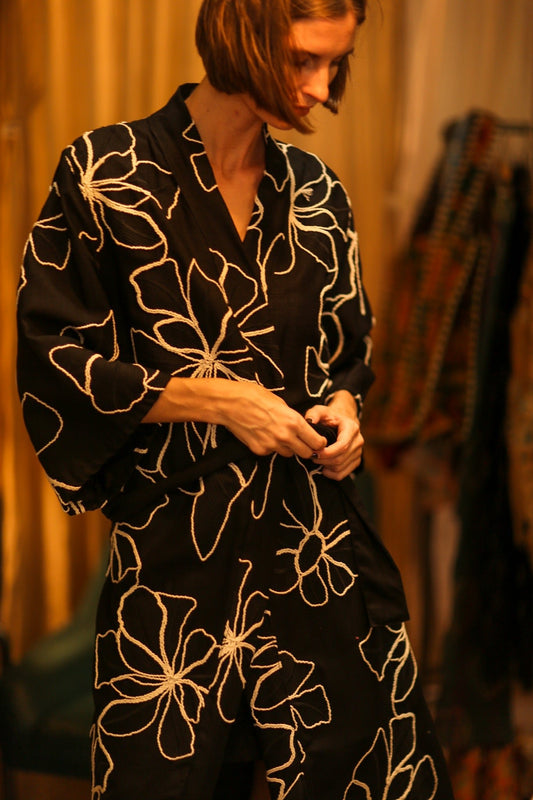 BLACK LINEN EMBROIDERED KIMONO MARIETTA