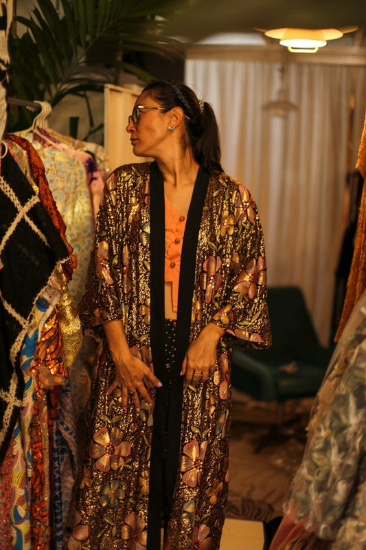 CHIFFON SILK SEQUIN EMBROIDERED KIMONO AENU