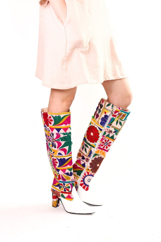 WHITE LEATHER / EMBROIDERED PATCHWORK DETAIL BOOTS DONNA